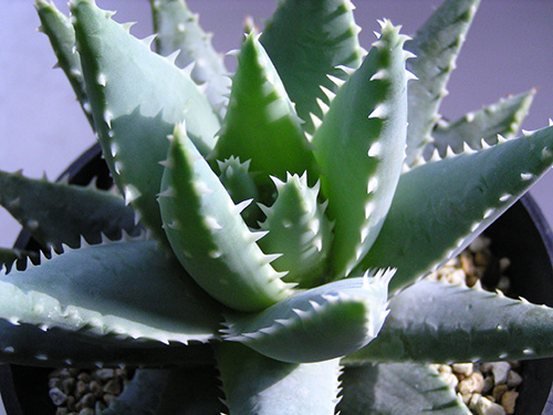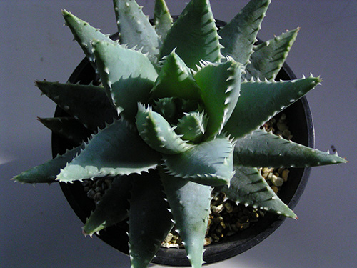 小型のアロエで葉の表面に柔らかい棘状のものが規則的に出ています。子株が出やすいのか根元に数本子株が見えます。(写真:国内)