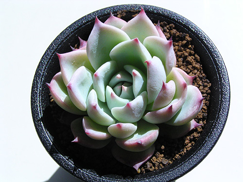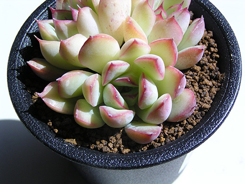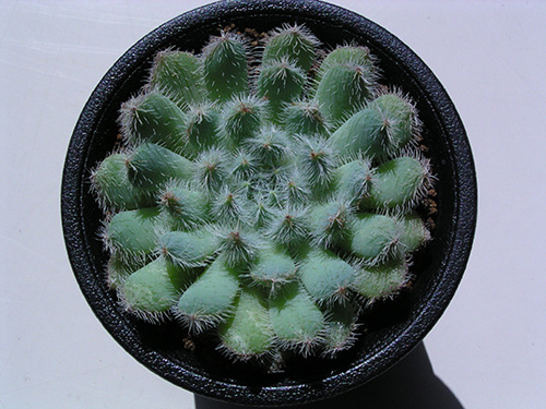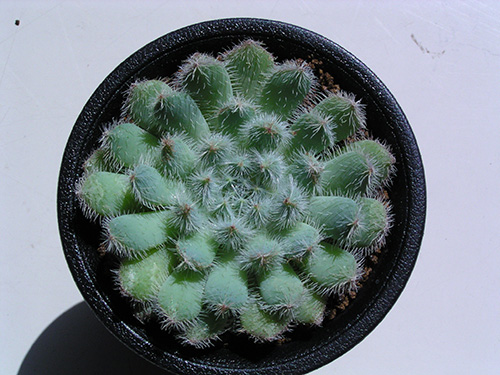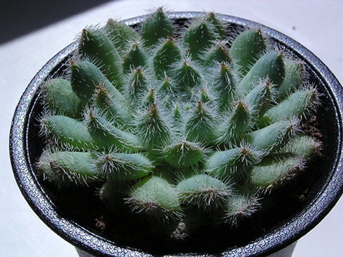 他のエケベリアと違って白い毛が生えているのが特徴。毛を触ってみると産毛ではなくやや硬い。日当たりの具合で毛の量が変わるようだ。(写真:国内)