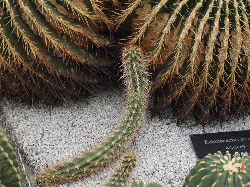這性のハシラサボテンで先端が成長して長くなるが後ろは徐々に枯れてくるので年々少し移動することになる。(写真:国内)