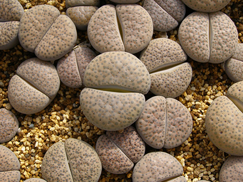 生ける石とも言われるほどに、現地では発見が困難なほど似ています。実際に生えている場所の岩や石などにまさしく擬態しており、自然の神秘を感じます。降水量が非常に少ない場所で育つため、思っているよりもさらに水遣りを控えたほうがよいように思う。寒さには非常に強い。(写真:国内)