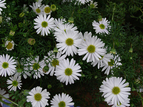 | 特徴など:多年草タイプのブラキカム。耐寒性もあり春先に植えておくと真冬を除いて結構咲いてくれる。匍匐性なので他の植物に侵食されないようにすれば徐々に広がってくれる。広がる速度は他の植物に比べて遅いような気がするので早く茂らせたい場合は多めに植えること。(写真:国内) |