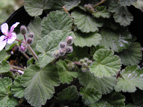 最近販売されているフウロソウの仲間。小さい濃いピンク色の花が咲きます。立ち上がらずに這って育つ植物です。(写真:国内)