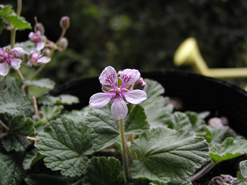 薄いピンクに二枚の花弁は赤紫色のスポットが入るエロディウム。(写真:国内)