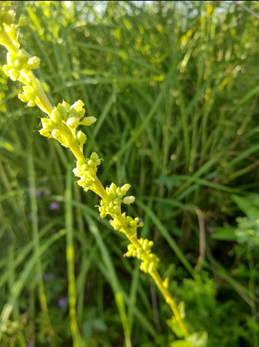 ススキの覆われる草地もしくは草原の道際にひょろっと一本この明るい黄色みのあるグリーンの花茎を立ち上げて咲いていた。朝日を浴びてから目立ったのか見つけてほしいように佇んでいる。園芸で見られる元ゴマノハグサ科の植物たちでは背が低い印象だが、目線まで伸びる植物とはちょっと思っていなかった。小さな特徴のある可愛い花をつけている。やや翼のある茎だ。また、花に夢中になって葉などの写真をあまり撮っていない・・・。(写真:国内)