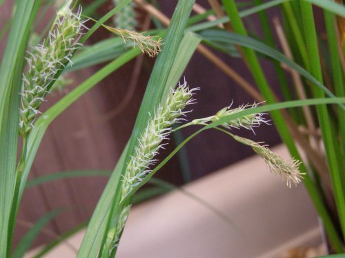 柔らかそうな葉幅の広いスゲ。穂についている実を数珠に見立てたというが、そんな風には見えないのだが・・・。(写真:国内)