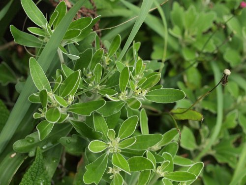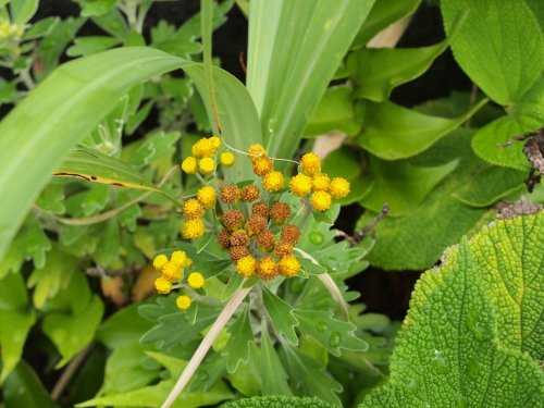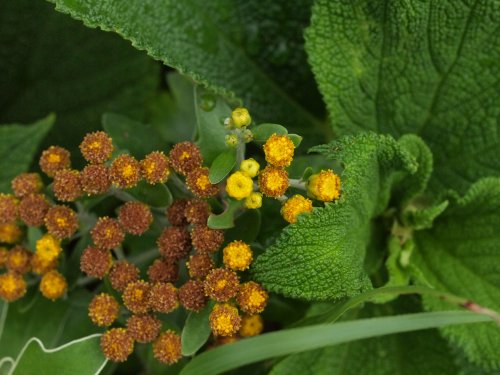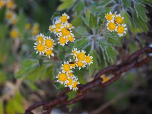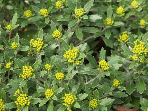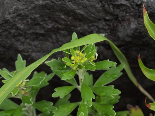 | 特徴など:秋になると花付きで鉢物として販売されることもある。海岸沿いに分布するキクの仲間。花は黄色で舌状花は無い。真鶴で見た野生のイソギクは日の光と海からの反射の光のせいかとても眩しくシルバーに輝いていました。上からの日差しよりも下からの日差しが海岸沿いは強いためにこのように葉の裏が白くなっているのでしょうか?我が家では開花がかなり遅くなり、蕾からとても時間がかかって咲きました。八丈島で見たタイプは葉の幅が広かった。(写真:国内) |