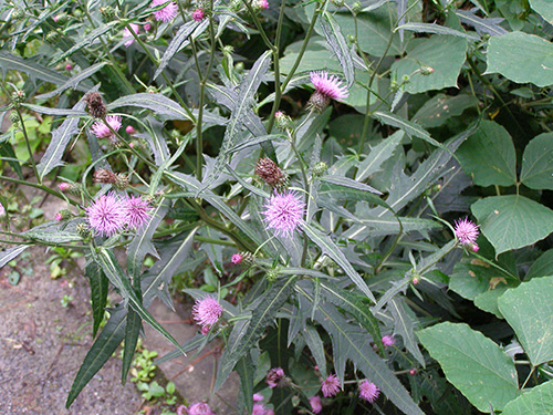 白いアザミで葯の部分が淡〜い赤紫色をしている。棘のあるロゼットの葉を残して花茎を立ち上げ花を咲かせる。自生している地域により花色が異なるようだ。根を薬用に用いる。(写真:国内、台湾)