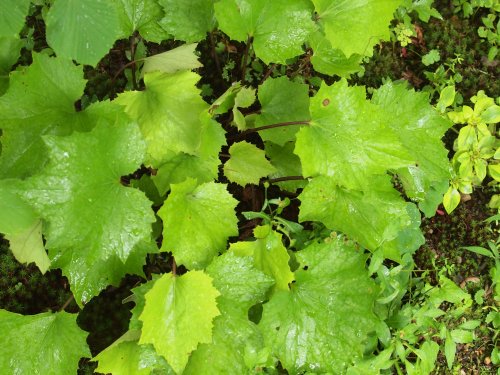 江戸時代には庭園の下草などに利用されていたという。海岸地帯に多く見られる。葉はやや円形で場所にもよるがやや肉厚な感じがする。葉に変異があり古くから珍重されていた。現在もいくつかの品種が残っている。台湾でも見られたが葉の縁は丸くなかった。若い葉柄の部分は食べることができる。ただし春先の若い展葉しきらないうちのものに限るようだ。あくを抜いてきゃらぶきや炒め物などに・・・。(写真:国内、台湾)