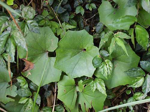 通常のツワブキに比べて葉の切れ込みが目立つツワブキです。また、葉の形も丸くならず半円くらいになっています。沖縄山中の林床などに見られました。(写真:国内)