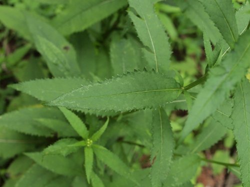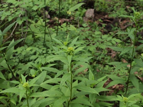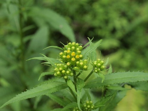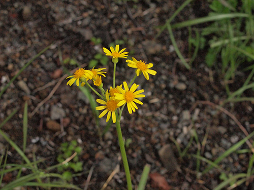 山地の自生する植物。花は黄色で舌が5弁ついている花をまばらな房状につける。最初に生えている太い茎から見ると花のころの茎はなんだかほっそりに見える。(写真:国内)