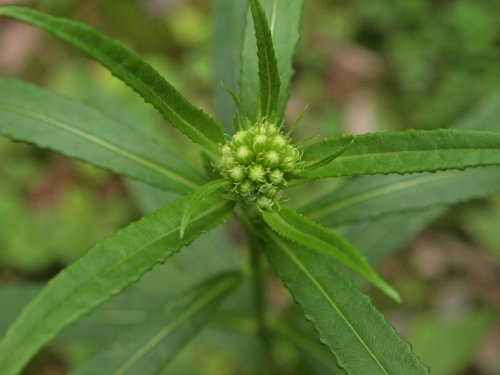 帰化植物。最近良く目に付くようなったと思う。冬でも見かけている。葉は触るとざらざらしている。黄色の舌状花が無い花をつける。(写真:国内)