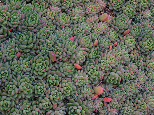 小さな棍棒状に葉がびっしりとつく這性のセダム。半日陰ではやや間延びして伸びてしまうが、日当たりがよいと見事に詰まってマット状に育つ。よく育ちますが蒸れる場所や長雨で停水するところでは腐ることがあります。(写真:国内)