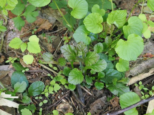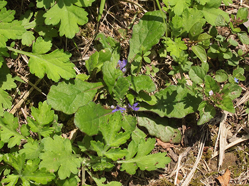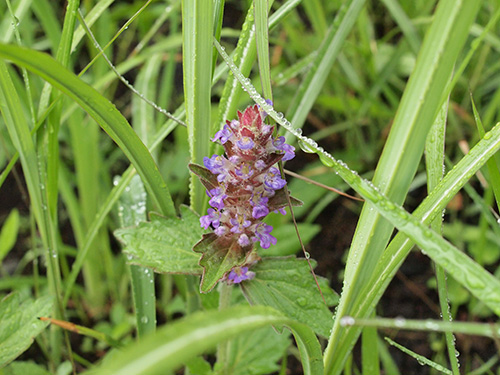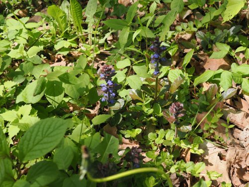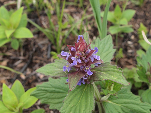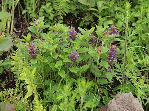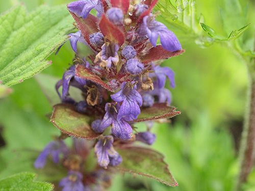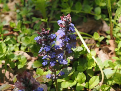 | 特徴など:グランドカバーに良く使われており、最近は下の写真にあるように斑入りのや小葉タイプのものが出回っている。花は濃い青紫色で穂状につきます。斑入り葉の品種は冬場に葉がしおしおになってなくなってくるのが残念です。多分ポットのままだと良くないのだと思うので早めに路地で育てましょう。多くの品種があるようですが、これからどんどんお目見えすることでしょう。日本には近縁種のジュウニヒトエがあります。日向よりも半日陰で育てたほうが綺麗に育ちます。(写真:国内) |