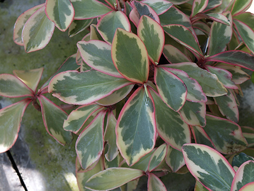 | 特徴など:多肉質で肉厚の葉が特徴のペペロミア。鉢植えでもよく販売されていて、このグリーンのほかに斑入りの品種もある。(写真:ハワイ・カウアイ島) |