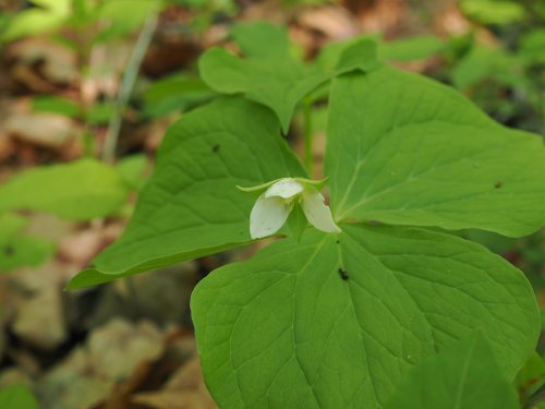 湿った林内に自生する。3方に広がった葉のうえに白く良く目立つ花をつけます。観察すると花びらの縁が丸いタイプととがるタイプがあるようですね。(写真:国内)