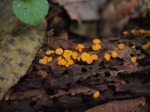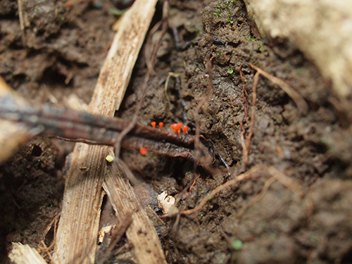 ちっちゃい赤みのあるキノコ。のちに黄色くなってくるようだ。枯れ枝にもよく見られる。たくさんついていることもあれば数個ということもある。似ているオチバノアカビョウタケは生えるところが枯葉の葉柄でさらに小さく生える。(写真:国内)