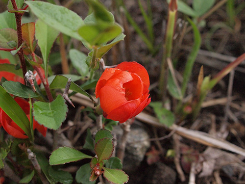 古くから日本に渡来した植物で、平安時代に庭木として使われとある。だが、和歌などに読まれたものが無いようで実際に使われ始めたのはもっと後で、漢方薬として実を輸入していたのかなと思う。多くの園芸品種があるようだが一番目にするのは朱赤の色のボケで他、東洋錦だろうか。(写真:国内)