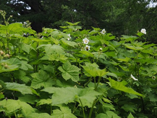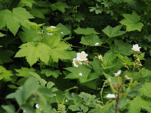 日本でのフユイチゴなど似ている。葉の表面には細かく縮緬皺のようになっている。葉裏が淡い茶褐色で花序がやや房になる。台湾でも一部地域で山地の標高2600m以上でまれにみられるそうだ。下の写真は花博跡地の温室内で葉が少し軟そうだ。(写真:台湾)