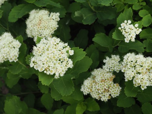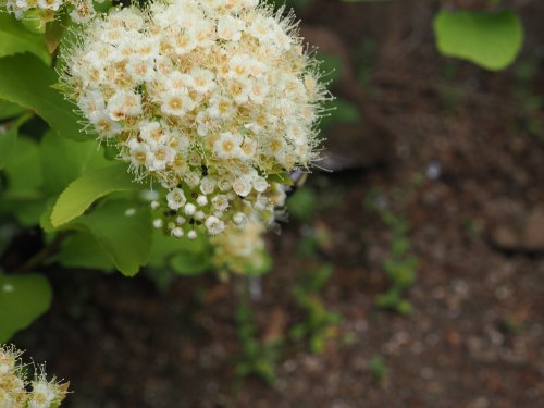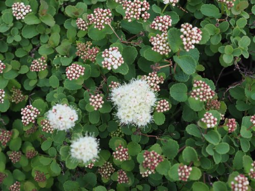 特徴など:高さが1mくらいの低木。散房花序。果実は袋果。5月ごろから新しい枝の先に花が咲き、花色は濃い赤ピンクだが変異が多い。花径は3mmくらいで五弁。名前は最初の発見地の下野(栃木県)に因む。最近は葉が黄金葉の種類[ライムマウンド]や黄金葉で新芽が赤みを帯びる〔マジック・カーペット〕が出ている。(写真:国内) |