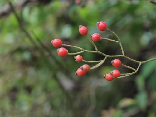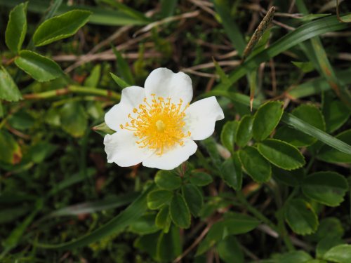 特徴など:高さが2mくらいになり、茎には刺がある。葉は奇数羽状複葉で互生する。葉の表面は光沢が無く、葉柄に托葉がある。白い五弁の白い花を5月ごろから咲かせ秋に赤い小さな実をつける。庭木や垣根、切花、また品種改良されたバラなどの重要な接木の台木として使われる。実際には台木以前に古くにヨーロッパなどに渡ったことで今までになかった房咲き性の性質を導入する元となった。秋に彩りを添える赤い小さな実は綺麗。切り枝としてよく利用されている。(写真:国内) |