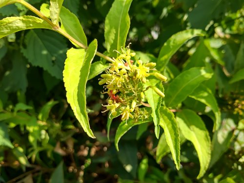 ライムグリーンの葉で黄色で花の終わりは赤くなる花をよく咲かせる。(写真:国内)