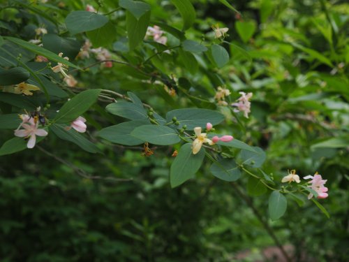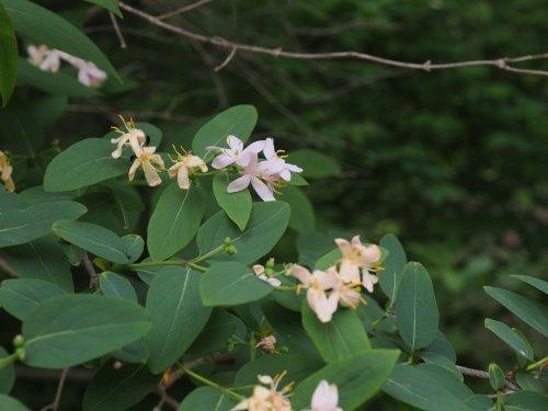 実がくっついてひょうたん状に見えることからヒョウタンボクとも言う。花色は白から濃い黄色に変わる。(写真:国内)