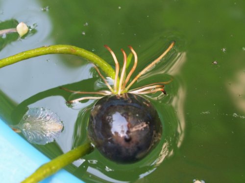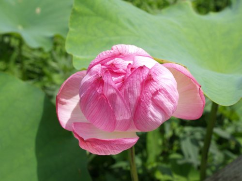 | 特徴など:ハスの根っこはレンコンで切ると穴がいっぱいあいている。最初の印象はここからでした。最近テレビでハス茶のことやハスの花の写真や香りをかいでからとても好きになりました。ただ自分で育てるとなると場所がやはり・・・。本当は花をきちんと撮りたいのですが、なかなかチャンスがありません。歴史的にも仏教に関連し蓮華と呼ばれるように非常に密接な関係がある。まあ、このことは専門書に任せるとして、ベトナム料理のお店に行ったら是非はすのお茶(厳密にはハスの花の香りをつけたお茶なんでしょね)を味わってみてください。葉は雨にも濡れず水をはじきうまく中心にたまると水滴が透明感あふれ輝いて見えるのが印象的。(写真:国内) |