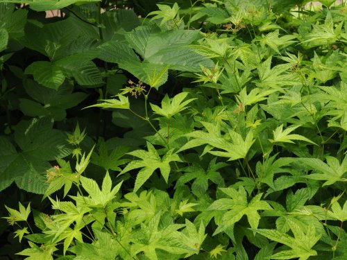 特徴など:観賞用に栽培されていて、自生地は日本とされているが実際の自生地はわからない。草丈は60cm〜1mほど。茎の頂部に散房花序で花をつける。半日陰や木陰でも育つのでシェードガーデンにも向きます。和名の由来は花序から京染めの鹿の子絞りを思わせるところから付けられたらしい。(写真:国内) |