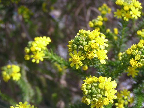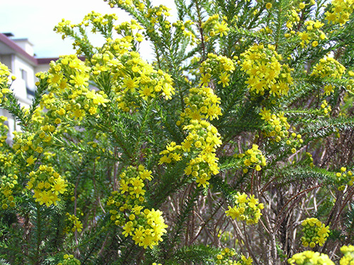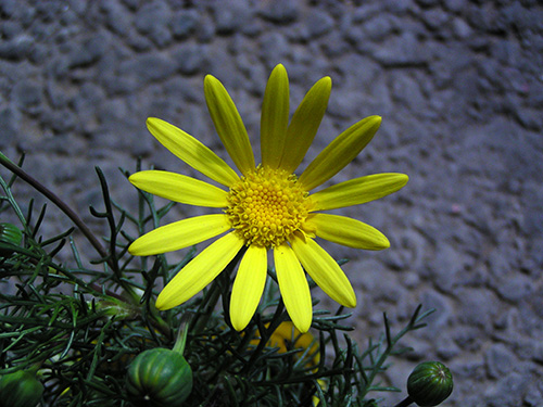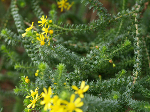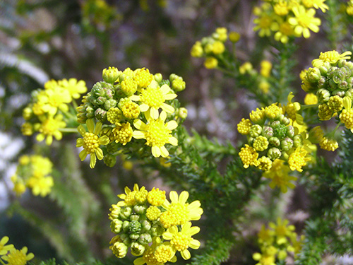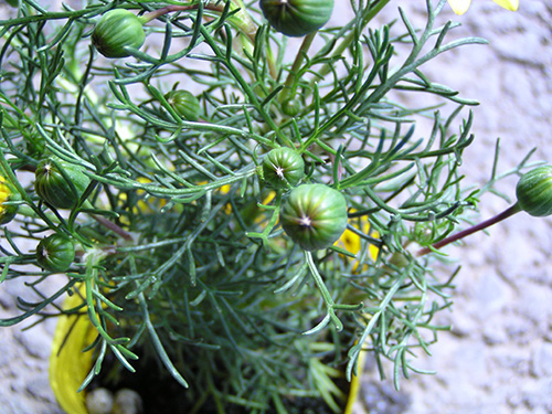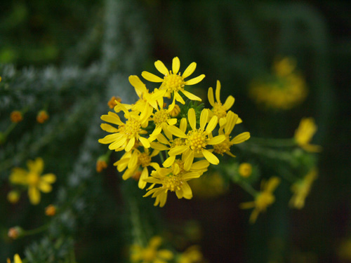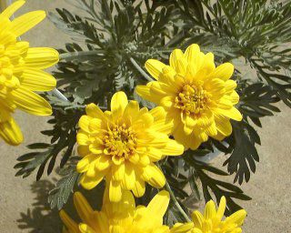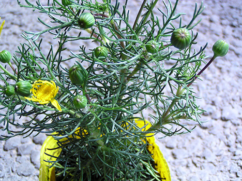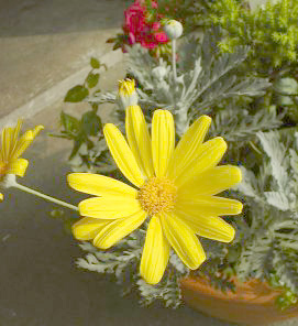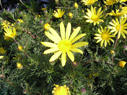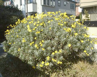| 特徴など:細かい切れ込みのある葉を持ち、白い産毛の生えたシルバーリーフも特徴。黄色いよく目立つ花をよくつける。最近は八重咲き品種も出回っています。コンテナや庭植えで非常に大きく育ちます。もったいないと思わずに切り戻しをしないと大変です。冬場でも以外に花をつけています。(写真:国内) |
