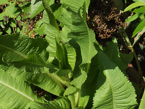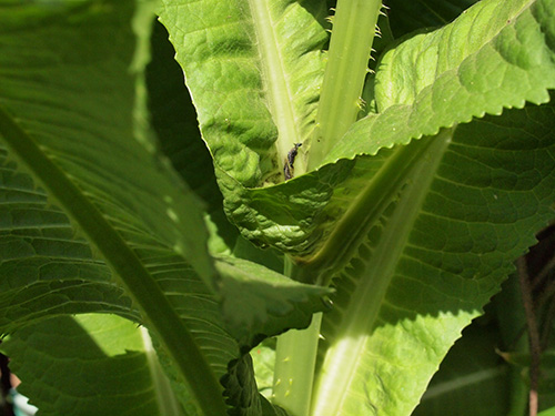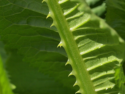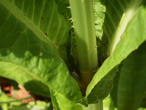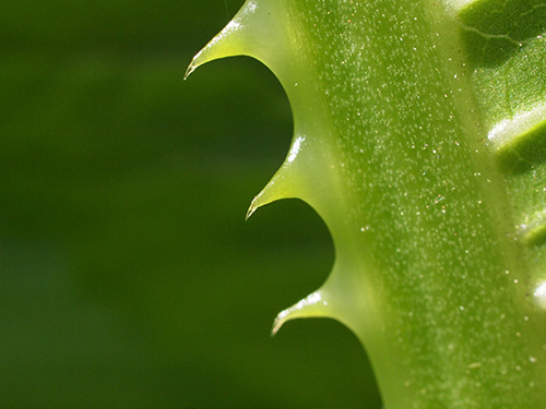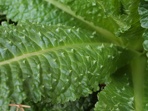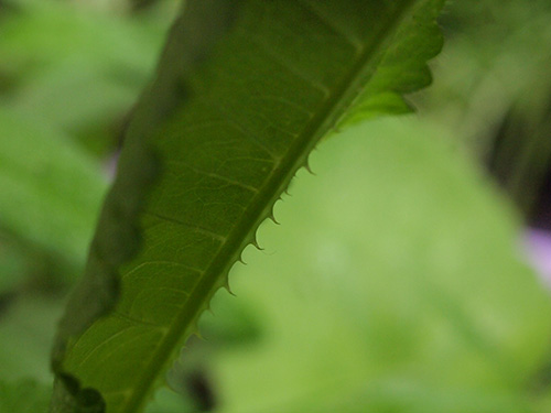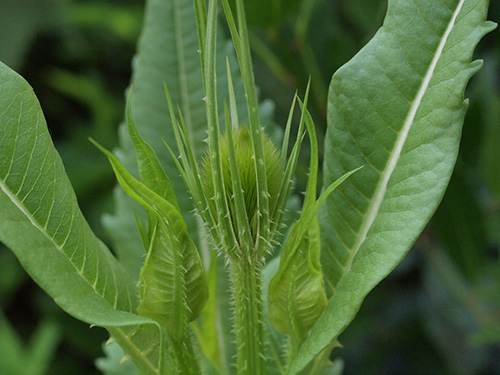 最近切花でも見ることができるようになりましたが、昔からドライフラワーでナチュラルのものと染色したものを見かけます。棘の部分は硬い。マツムシソウ科(現在はスイカズラ科)のスカビオサ(マツムシソウまたは西洋マツムシソウ)に比べると苞の固さは全く違いその堅い方の中から小さな花がたくさん咲きます。冬場のロゼット状になっていても葉の表面には堅い刺がしっかりとあります。育ててみて面白いのは花が上がってきた花茎の部分の葉の表面には刺が無くなってくることと、葉が対生についているが、その部分が水がたまるようになっていることで、学名もその名に因んでいることも改めて知りました。育ててみると面白い発見が再確認できていいですね。さらに水がたまると虫が溺れますがその部分からの花茎の伸びがよくなるそうで、早く知っていれば試しに肥料をやってみたかった。(写真:国内)