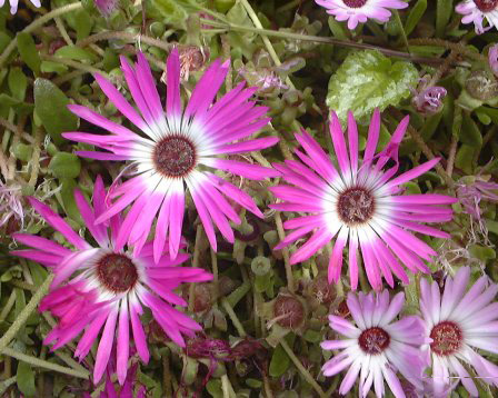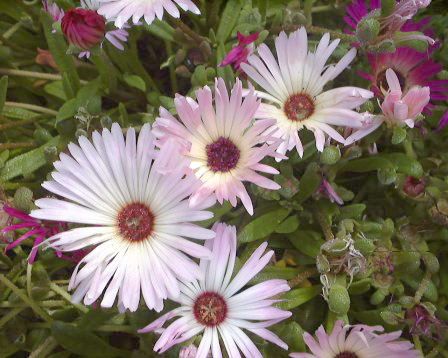 | 特徴など:きらきらと光るような花びらを持ち日があたると本当に綺麗だ。肉厚の葉の表面に透明感のある粒子っぽいものが見える。花色は白〜淡いピンク〜ピンクに近い赤紫色など様々。水のやりすぎもいけないが極度の乾燥にも要注意。マツバギクが良く売れるがこのリビングストーンデージーも見直して欲しい植物だ。(写真:国内) |