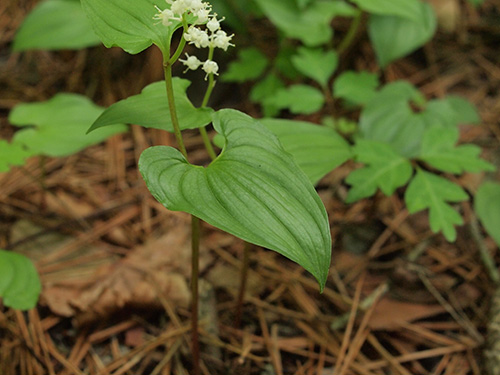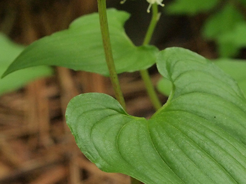 | 特徴など:マイヅルソウに似ているが、花は2週間ほど早く咲いていた。茎には荒く毛があり葉の縁には短く毛が並ぶ。(写真:国内) |