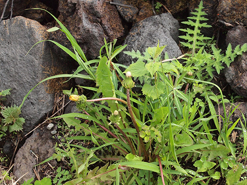 | 特徴など:先にも出たように帰化植物だ。在来種を脅かす存在だ。もっともその原因は人間の公共事業や自然破壊の影響も重なってのことだ。最近は東京は温暖化や排気ガスの影響でヒートアイランドになっていて道路の片隅で1月でも黄色の花を咲かせるのを見かける。寒いから花茎はあまり伸びないでロゼットのすぐ上で咲いている。本当にたくましいと思う。健康食品の流行でタンポポコーヒーが作られているので、ご自身でも作るときはこちらのセイヨウタンポポで作ってほしいと思う。(写真:国内、ハワイ・カウアイ島) |