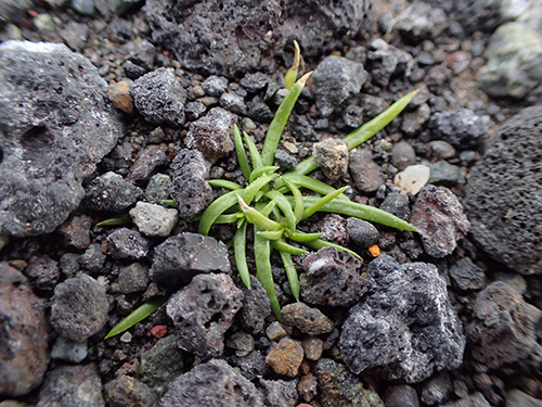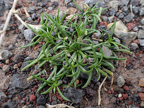 一点から放射状に延びて広がる。帰化植物としてオーストラリアだけでなく日本などにも見ることができるようだ。調べると埋土種子としての寿命が長く5年以上となっていたので、何かについて移動してその場所にとどまり少し埋まっていても環境が整えばいつでも出る機会をうかがっている植物のひとつだ。小さい種なのにすごい生命力。(写真:西オーストラリア)