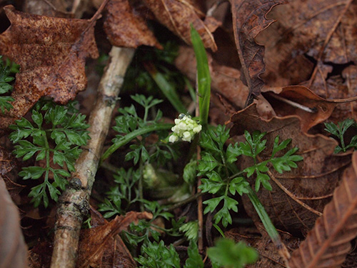 セリ科特有の花だが、小さくてかわいい。春先のちょっと寂しい林床をにぎやかにしてくれます。(写真:国内)