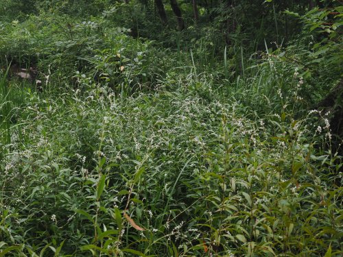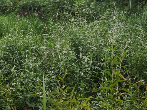 花は密生状態ではなく疎で白い花が咲く。群生で咲いていると綺麗。(写真:国内)