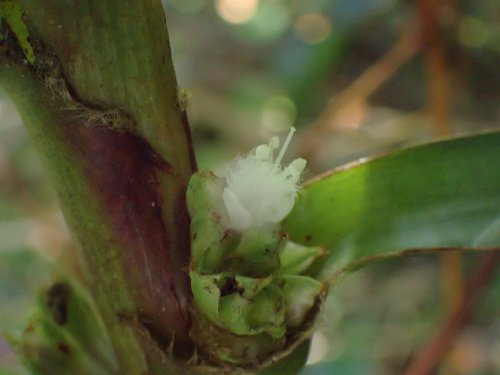 | 特徴など:一見コスツスの仲間のようにも見える立ち姿で、よくよく見れば小さな白い花を見て、ツユクサの仲間っぽいとわかる。花弁らしきものは見えるような見えないような、でも蕊の周りに見られる白いひげ状のものが小さいながらも主張している。12月に行ってみたら赤い実がついていた。良く目立つが鳥に食べさせているのだろうか?(写真:台湾、国内) |