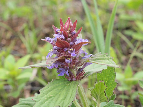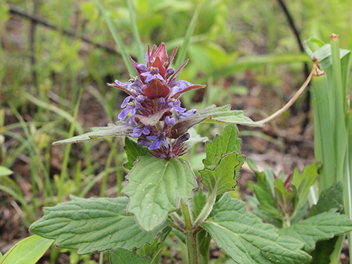 | 特徴など:グランドカバーに良く使われており、最近は下の写真にあるように斑入りのや小葉タイプのものが出回っている。花は濃い青紫色で穂状につきます。斑入り葉の品種は冬場に葉がしおしおになってなくなってくるのが残念です。多分ポットのままだと良くないのだと思うので早めに路地で育てましょう。多くの品種があるようですが、これからどんどんお目見えすることでしょう。日本には近縁種のジュウニヒトエがあります。日向よりも半日陰で育てたほうが綺麗に育ちます。(写真:国内) |
