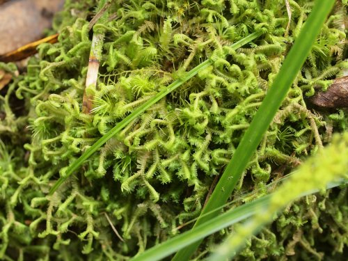 二又二又と別れていてわかりやすいコケ。山地のやや湿っている土の壁面や倒木上にみられる。下側から細長いひも状の鞭糸と呼ばれるものを伸ばす。これが鞭に見えるところからこの名前があるようです。(写真:国内)