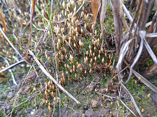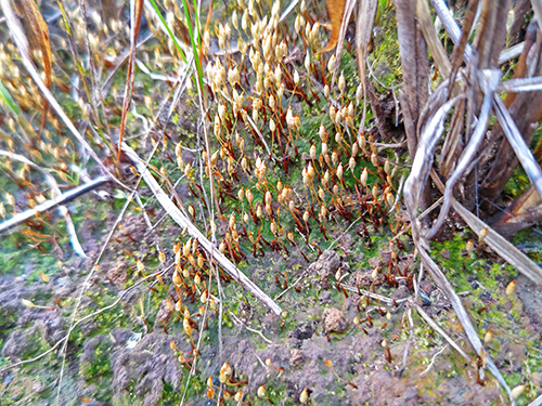 土から直接胞子嚢が出ているように見える。緑色の苔のように見える部分が原糸対と呼ばれる部分でここで苔の葉の役割をしているようです。実際には所々に小さなスギ状の葉がちらちらと生えている。(写真:国内)