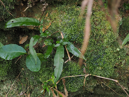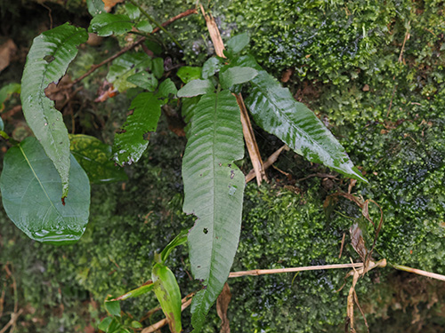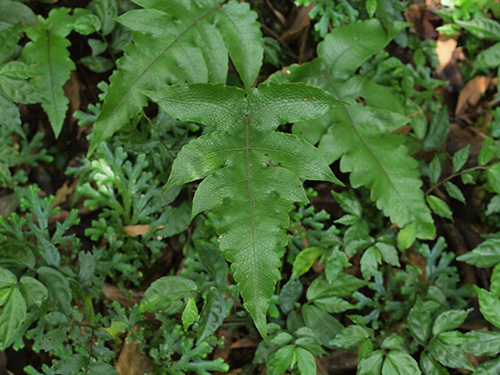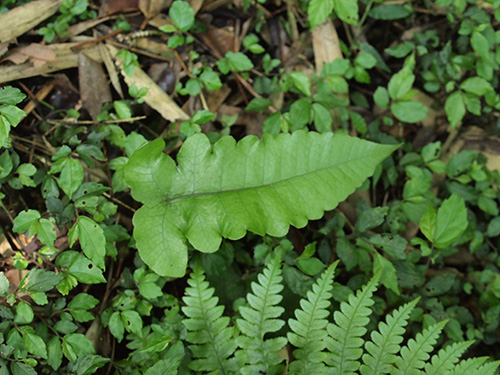 コウモリシダの葉が一枚だけのような姿です。時折下の部分には葉が付いていて3出になることもあるようです。よーくみると葉の表面は爬虫類のうろこみたいです。(写真:国内)