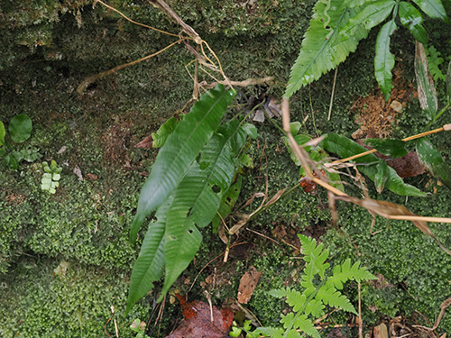 葉が三枚出ているように見えるシダです。筋がよく目立ちます。山地の明るい半日陰の場所で育っていました。上記のミゾシダと同じ仲間には見えませんね。(写真:国内)