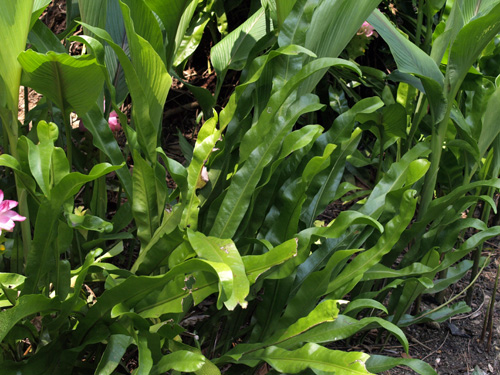 照りのある葉で結構肉厚。垣根の下草や花壇の縁取りに利用されていました。葉の裏には丸い胞子のうがたくさんついていて、ちょっと見、気持ち悪いです。(写真:ハワイ・カウアイ島、スリランカ)