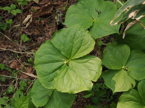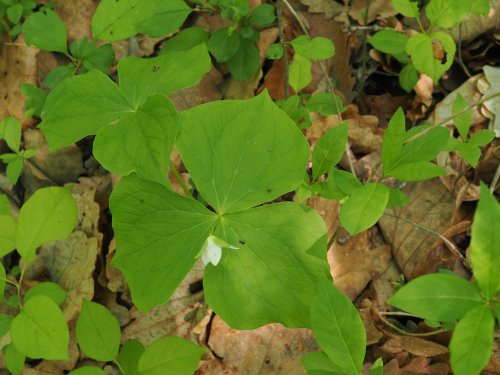 湿った林内に自生する。3方に広がった葉のうえに白く良く目立つ花をつけます。観察すると花びらの縁が丸いタイプととがるタイプがあるようですね。(写真:国内)