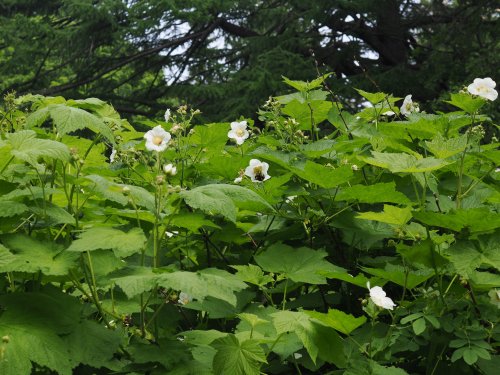 日本でのフユイチゴなど似ている。葉の表面には細かく縮緬皺のようになっている。葉裏が淡い茶褐色で花序がやや房になる。台湾でも一部地域で山地の標高2600m以上でまれにみられるそうだ。下の写真は花博跡地の温室内で葉が少し軟そうだ。(写真:台湾)