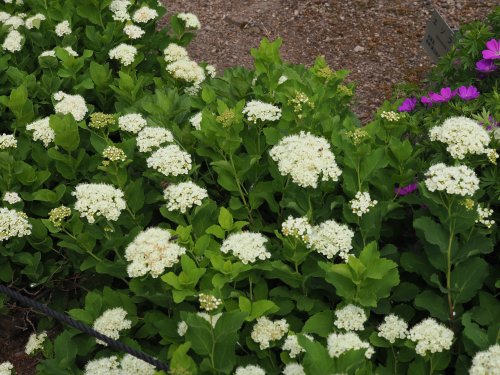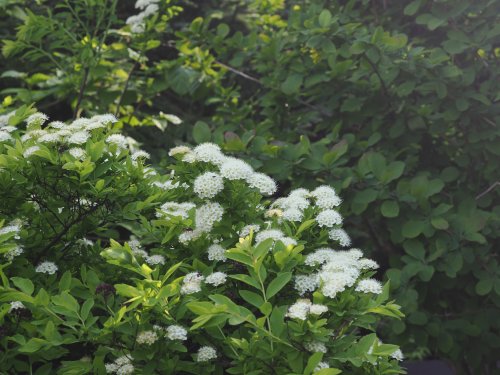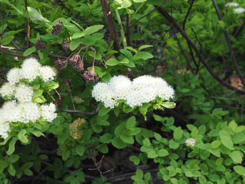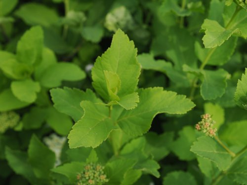 特徴など:高さが1mくらいの低木。散房花序。果実は袋果。5月ごろから新しい枝の先に花が咲き、花色は濃い赤ピンクだが変異が多い。花径は3mmくらいで五弁。名前は最初の発見地の下野(栃木県)に因む。最近は葉が黄金葉の種類[ライムマウンド]や黄金葉で新芽が赤みを帯びる〔マジック・カーペット〕が出ている。(写真:国内) |