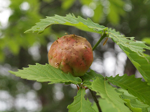 | 特徴など:柏餅で知られるカシワ(柏)。丸みのある鋸歯(?)で葉は他のこの仲間の中では大きいです。カシワにも虫こぶを作る蜂のリンゴナラフシがついていた。(写真:国内) |