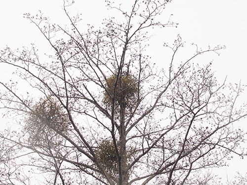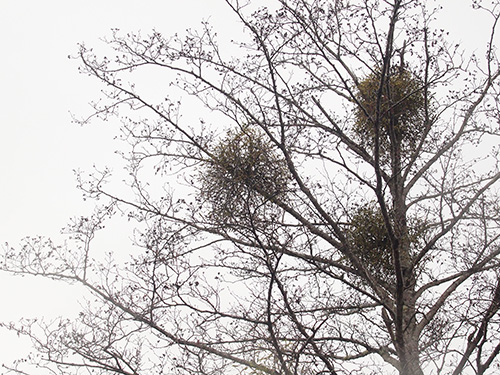 冬になって落葉樹の葉がなくなると、このようなグリーンのボール状のものが出現する。ヤドリギだ。もちろん、普段でもエノキやケヤキ、ブナなどに寄生しているのを見ることができる。実はやや黄色で触ってつぶすと粘着質のような果肉が出てくる。鳥が食べて糞をするとその粘着質のものと一緒に枝や幹にくっついて寄生する。植物の進化って本当に不思議だといつも思う。ヨーロッパでは玄関の軒にクリスマスのときに吊り下げて飾りにする。枝は意外にも固くなくて、太い根元の部分でも柳よりも弾力がある。(写真:国内)