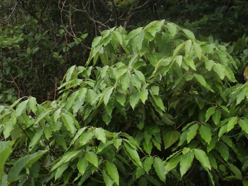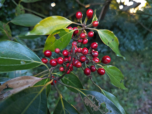 ヤブニッケイに似た照りのある葉を付ける。新芽が産毛に覆われていて面白い。花が晩秋に咲き、実が翌年の晩秋になるそうで同時に見れるとあるが残念ながらまだ見たことがない。葉の裏が白いのでウラジロダモの別名も納得です。雌雄異株。(写真:国内)