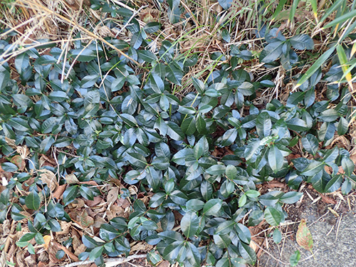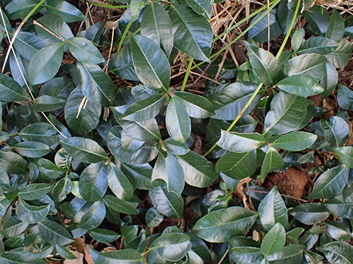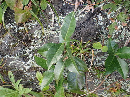 一般に見られるテイカカズラよりも葉が大きいように思います。道路わきの斜面の上から垂れ下がりつつ育っていました。(写真:国内)